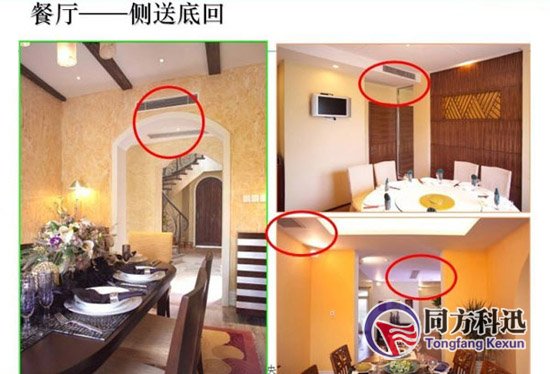 上回風下回風方式也是一種基本的方式。送風口安裝在房間上面,回風口安裝在房間的底部。冷暖風從房間上方吹出,回風口將下方較冷的空氣排除,從而保證房間能夠較快制冷制暖。上回風下回風能夠解決室內房間溫差較大的問題,保證房間溫度均勻舒適,但是室內機安裝在墻壁夾層之內,不適用于面積較小的房間。特殊需要注意的是,回風口由于安裝在下層,選擇安裝位置時需要保證人員流動較少區域和沒有障礙。