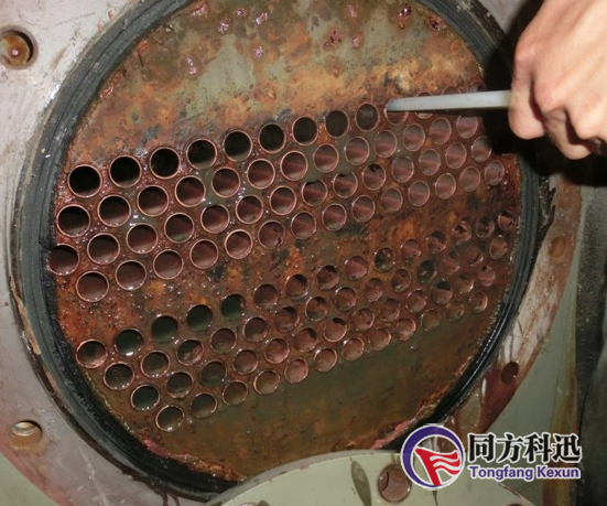6、 可打開冷凝器端蓋,用毛刷在每根冷凝器銅管內(nèi)壁來回通拉,將每根冷凝器銅管內(nèi)壁的污泥水垢清理干凈;用高壓水槍將每根冷凝器銅管內(nèi)壁的污泥水垢清理干凈,要求露出銅管金屬表面,光亮無腐蝕;